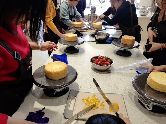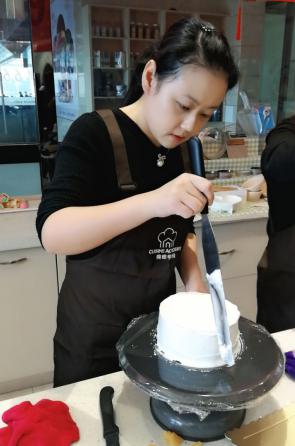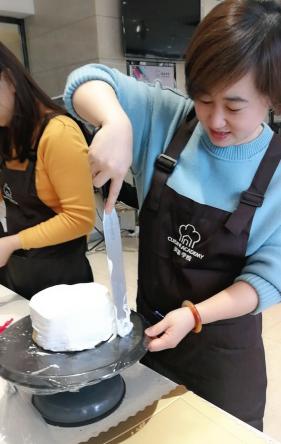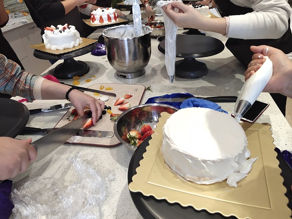 下午1點,16名女神集結一起,分別就位兩張工作臺。蛋糕胚、工具早已碼放整齊,當圍裙穿上身,蛋糕DIY活動正式拉開序幕。蛋糕老師先行打好奶油,并逐步講解制作過程,邊操作邊講解,讓創(chuàng)銳女神很快上手,無論是美食大咖還是廚藝小白架勢全都有模有樣,抑或是女神與生俱來的天生本領,抑或是創(chuàng)銳女神往日工作雷厲風行的風格積淀。