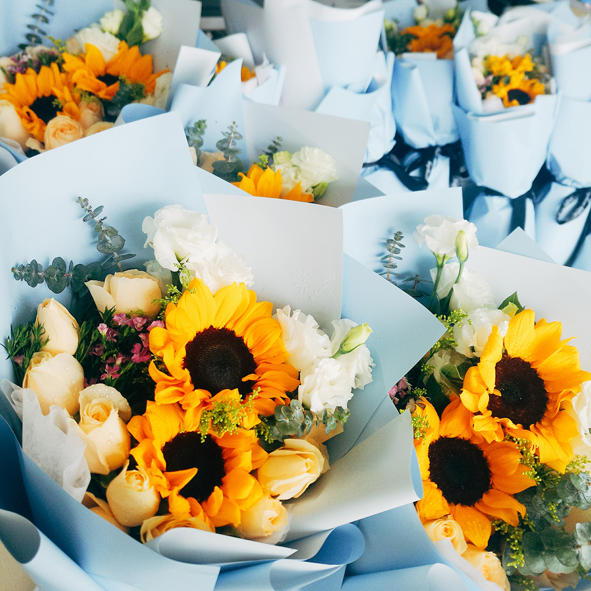 太陽花花語是熱情、陽光,能給人帶來美好希望;香檳玫瑰花語是長久熱愛、鐘情一人;白桔梗花語是永恒的愛、真誠的愛;相思梅花語是對(duì)遠(yuǎn)方的思念。希望這一束象征美好與愛的花束能給公司所有女同事送去美好祝愿。